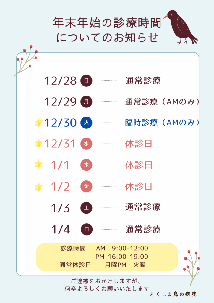 なお12/30(火)は通常休診日ですが、午前中のみ臨時診療させていただきます。